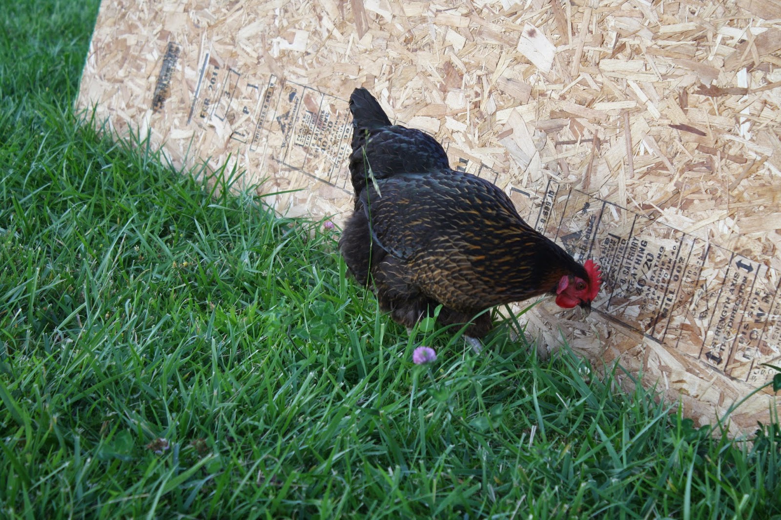 The next picture is of Eugenia. Eugenia had a bit of an issue. When she came to the house she got it in her head to get broody or “laying” where she quit laying eggs, sat on the eggs the other eggers laid, so they were laying eggs in the pen. To “break up a laying hen” you have to isolate her from the other hens so there are no eggs for her to sit on. Eventually, she will lay an egg to sit on it, but laying the egg will reset her brain so she doesn't want to sit on it. We kept her by herself in Dad's chicken tractor for two weeks. She also molted a lot of feathers which is also common. Once I found an egg in the nest box, I reunited her with the other hens.